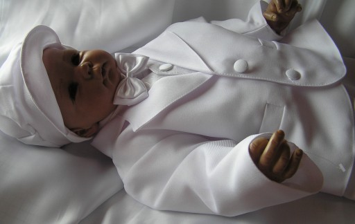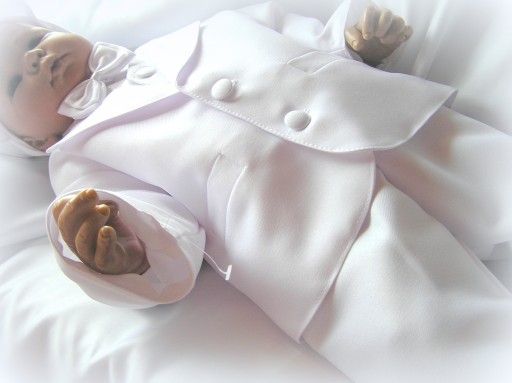 Kompet uszyty jest z bielutkiej tkaniny garniturowej . Składa się z marynarki, kamizelki na białej cienkiej podszewce, spodni z kieszonkami po bokach, na gumce w pasie co pozwala idealnie dopasować je do wymiaru niemal każdego maluszka.Kaszkiecik biały posiada z tyłu bialy, bawełniany ściągacz, dzieki czemu lepiej utrzymuje się na głowce malucha. W skład komletu wchodzi rówiez biała bawełniana koszulka lub koszulobody wraz z białą muszką wiązaną z tyłu dla lepszego dopasowaia do szyjki dziecka - nie wykonujemy dla maluchów muszek na gumce. Zarówno marynarka jak i kamizelka zapinane są na guziczki, ładnie wykonczne białą tkanina garniturową.