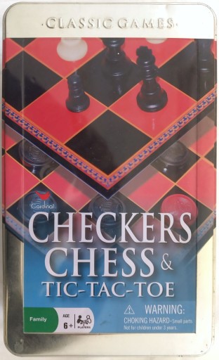 Przedmiotem aukcji są używane szachy, warcaby oraz kółko i krzyżyk w metalowej puszce marki Cardinal.
