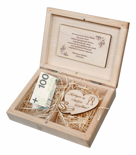Chcesz elegancko wręczyć prezent w postaci gotówki? Mamy dla Ciebie rozwiązanie - pudełko na pieniądze na ślub, wesele, dla młodej pary, grawerowane pudełko jest idealnym prezentem. Prezent 3 w jednym: etui na banknoty, życzenia zastępujące kartkę oraz pudełko, które będzie pamiątką może służyć jako pudełko na drobiazgi.