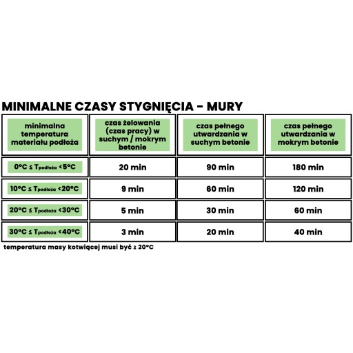 Poniższe czasy stygnięcia podane są dla żywicy w temperaturze 20℃. Jest to temperatura najbardziej optymalna do wyciskania masy. Przy niższych temperaturach trudniej wyciska się żywicę, a czas utwardzania wydłuża się.