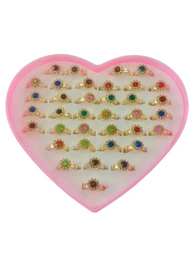 Zestaw 36 pierścionków z błyszczącymi kolorowymi oczkami, zachwyci małą damę. Każda dziewczynka pokocha ten zestaw.