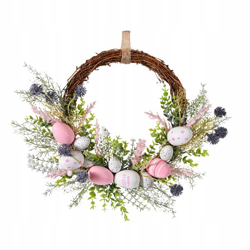 WIELKANOC JAJKA WIELKANOCNEGO: Wieniec kwiatowy jest ozdobiony jedwabnymi kwiatami, liśćmi, jajkami i innymi elementami, co jest bardzo harmonijne i pięknie wygląda.