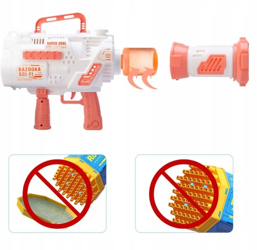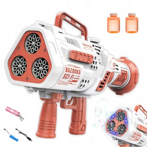 - Wystarczy lekko nacisnąć, karabin maszynowy bazooka może automatycznie rozpylać olśniewające kolorowe bąbelki, którym towarzyszą romantyczne światła.