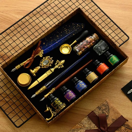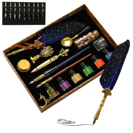 Set 1/Set 2/Set 3: Including 1 quill dipping pen, 1 glass dipping pen, 1 water rod dipping pen, 18 replaceable nibs, 6 bottles of ink 10ml, 1 bottle of wax varnish, 1 stamp, 1 spoon, 1 gold-box round wax, 1 glass pen cup, 1 letter opener, 1 metal pen holder and other exquisite gift calligraphy set; weight 720g, package size 29*21*4cm