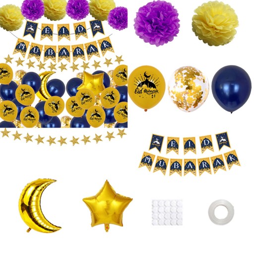 PAKIET ZAWIERA: 6 szt. kwiatów bibułkowych Poms, 1 zestaw brokatowego banera Eid Mubarak, 1 zestaw zawieszki z jasną gwiazdą, 8 szt. 12-calowego balonu z cekinami, 12 szt. 12-calowych balonów lateksowych z nadrukiem, 14 szt. 12 cali niebieskich balonów lateksowych, 1 szt. 18 cali balonu z folii aluminiowej w kształcie księżyca, 1 szt. 18 cali aureate star aluminium, 1x wstążka i 1 szt. kleju w arkuszach
