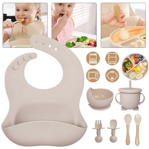 🍀 【Zestaw 8】Zestaw naczyń dla dzieci zawiera 1 regulowany śliniaczek dla małych dzieci, 1 talerz z przyssawką,1 silikonową miskę dla niemowląt z przyssawką, 1 silikonowy kubek do picia z uchwytem i słomką, 2 silikonowe łyżeczki dla małych dzieci i 2 silikonowe widelce dla małych dzieci. Zestaw talerzy dla dzieci to wspaniały prezent dla ukochanego dziecka, aby jedzenie dla niemowląt było smaczniejsze i pomoże mu samodzielnie jeść.
