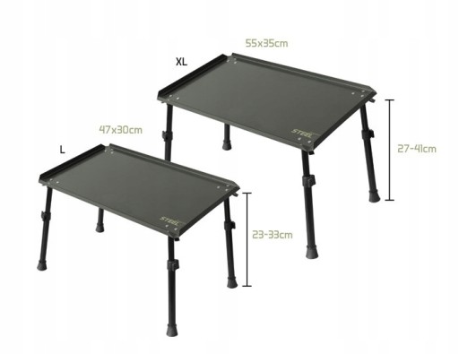 Wytrzymały i praktyczny stół STEELS może być używany do oprawiania, a także do porannej kawy na biwaku lub wieczornego grilla. Metalowy blat ma wymiary 47 x 30 cm (wersja L) lub 55 x 35 cm (wersja XL). Narożniki stołu są otwarte, aby lepiej odprowadzić wodę, jeśli stół przypadkowo zostanie pozostawiony rozłożony podczas deszczu. STEELS ma solidne nogi teleskopowe. Regulowana wysokość stołu wynosi między 23-33 cm (wersja L) lub 27-41 cm (wersja XL). Nogi można „zablokować” specjalnym mechanizmem, aby zapobiec niepożądanemu wywróceniu się stołu. Nogi są gumowane. Stół jest wyposażony w torbę do przenoszenia.