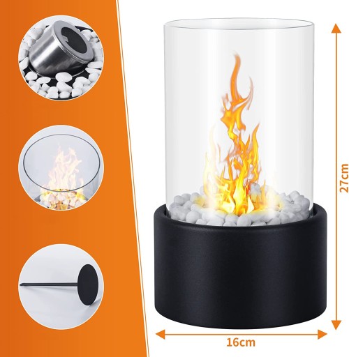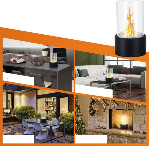 🔥 Klasyczne i eleganckie wzornictwo - kominek stołowy jest wykonany z nowoczesnego, czarnego metalu. Za przezroczystą i zdejmowaną, odporną na wysokie temperatury szklaną rurą można obserwować taniec płomienia 360°, który jest modny i interesujący.