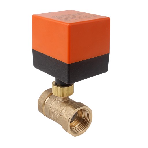 Dwudrogowy elektryczny zawór kulkowy z siłownikiem do sterowania układami hydraulicznymi.