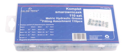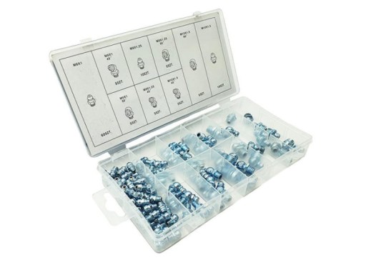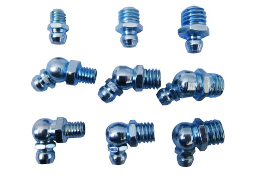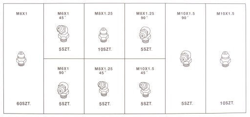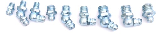 Zestaw zawiera smarowniczki proste, pod kątem 45° I 90° z gwintem M6, M8, I M10.