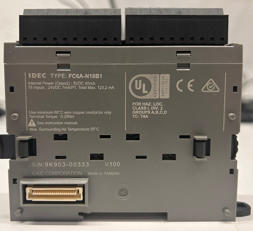 Moduł rozszerzający 16 wejść IDEC FC6A-N16B1. Moduł zamontowany był w prototypie maszyny i używany tylko podczas testów prototypu. Technicznie jest w pełni sprawny, w kondycji jak nowy. Stan wizualny przedstawiają zdjęcia.