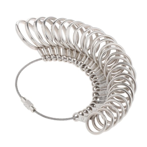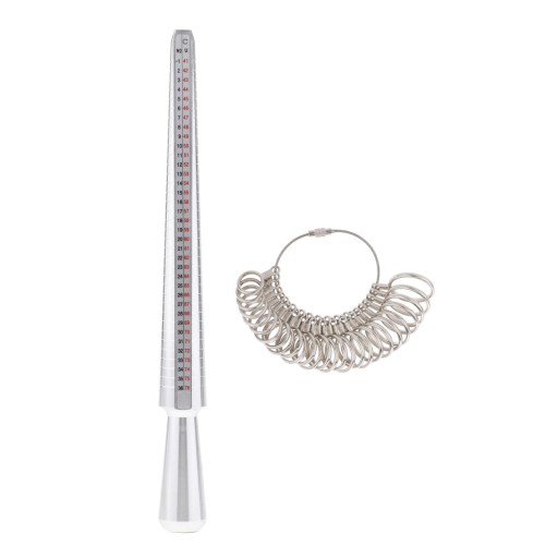 Pakiet zawiera: 1 x trzpień do miarkowania pierścionka; 1 x wskaźnik rozmiaru pierścionka