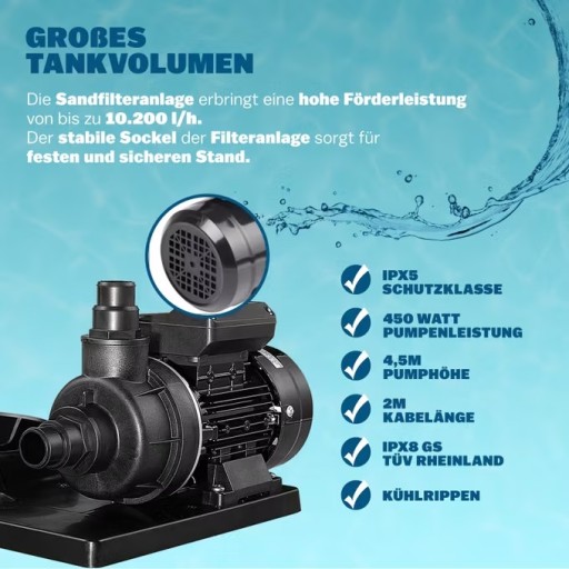 Duża pojemność zbiornika Nasz system filtra piaskowego ma dużą pojemność zbiornika wynoszącą ok. 25 litrów. Do zbiornika filtra można wsypać do 20 kg piasku filtracyjnego. W filtrach piaskowych znajduje się wkład, w którym umieszcza się piasek kwarcowy lub szklany granulat. Zalety produktu: