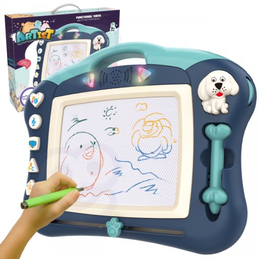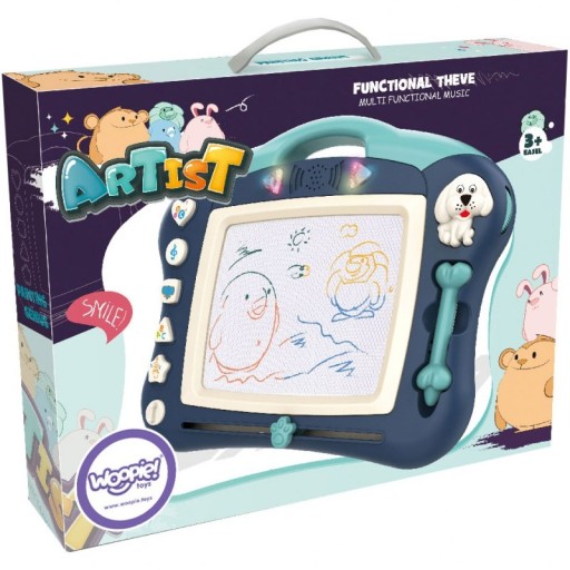 Znikopis Tablica Magnetyczna daje możliwość kreatywnej zabawy na długi czas! Tablica zachęca do pisania i rysowania. Rysowanie pozwoli skoncentrować, wyciszyć i uspokoić Twoje dziecko. Znikopis pozwala na tworzenie nieskończonej ilość obrazków – wystarczy przejechać specjalnym suwakiem, a rysunek zniknie i można rysować od nowa! Zestaw dodatkowo zawiera wygodny wygodny magiczny długopis. Dodatkowo 5 multi funkcyjnych guzików: guzik piosenek, melodii, zwierząt, liter oraz konwersji. Podczas wydawania dźwięków tablica świeci przykuwając wzrok dziecka. Tablica posiada wygodny uchwyt, dzięki czemu dziecko może zabrać ją wszędzie oraz posiada możliwość wystawienia nóżek, które ułatwia pisanie przy stole dziecku. Znikopis rozwinie u dziecka zdolności manualne, wyobraźnie, kreatywność oraz pomoże w rozwinięciu artystycznej strony dziecka!