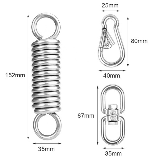 - Dwa duże karabińczyki są po prostu zaczepiane do oczek sprężyny, a karabińczyk ma nośność do 250 kg.