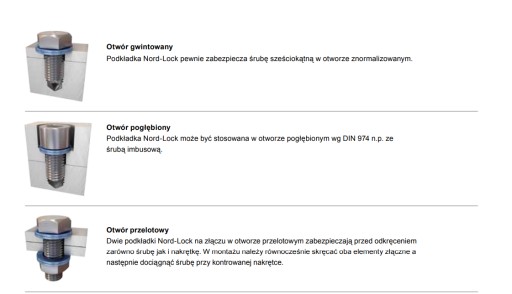 Podkładki NORD-LOCK to unikalny i niezwykle skuteczny system zabezpieczeń połączeń śrubowych przed samoczynnym luzowaniem spełniającym normy DIN 25201. Zastosowana w produktach NORD-LOCK metoda działa w oparciu o blokujące działanie klina i w pełni zapobiega odkręcaniu się śrub i nakrętek poddawanych działaniu obciążeń dynamicznych, a zwłaszcza wibracji i drgań.