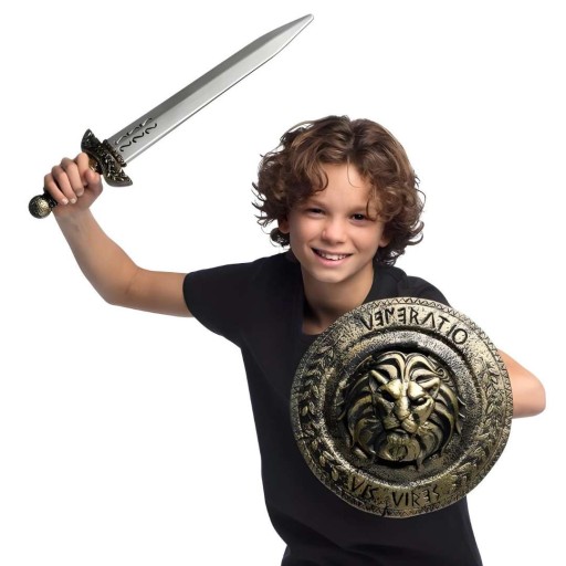 Wybierasz się z dzieckiem na imprezę kostiumową, LARP bądź rekonstrukcję historyczną? A może poszukujesz po prostu ciekawych dodatków do zabawy lub sesji zdjęciowej? Zestaw wojownika z pewnością sprawdzi się doskonale! W komplecie znajduje się krótki miecz oraz okrągła tarcza. Tarcza i rękojeść miecza mają złoty kolor, który nadaje im elegancji. Na tarczy widnieje herb w postaci lwa. Na obu elementach rynsztunku widać też liczne symbole i zdobienia. Całość sprawia bardzo realistyczne wrażenie.