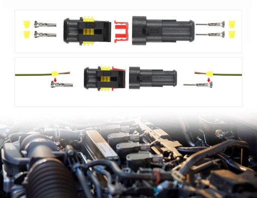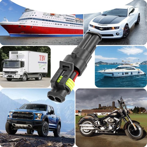 - 2Pin (6 zestawów) 6 x męskie złącze obudowy, 6 x żeńskie złącze obudowy, 12 x męski pin, 12 x trzpień żeński, 24 x silikonowa wodoodporna wtyczka