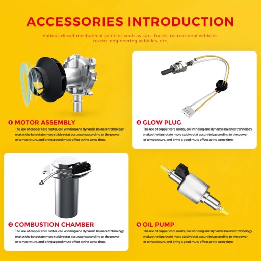 Szerokie zastosowanie: Jako ogrzewacz do każdego pojazdu z silnikiem Diesla, ogrzewacz piętrowy jest powszechnie używany do ogrzewania kabin samochodów, kamperów, przyczep kempingowych, ciężarówek, statków itp. To urządzenie grzewcze samoczynnie wydmuchuje ciepłe powietrze, nie powodując zużycia silnika ani odkładania się w nim osadów węglowych, wydłużając w ten sposób żywotność silnika o 30%. Dzięki kompaktowej i przenośnej konstrukcji jest to doskonały wybór do domu i sklepu.