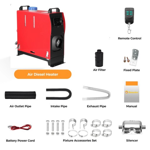 Łatwy montaż : 1 x wielofunkcyjny podgrzewacz diesla (z wyświetlaczem LCD) / 1 x pilot zdalnego sterowania / 1 x tłumik / 1 x płyta stała / 1 x filtr powietrza / 1 x rura wlotowa / 1 x rura wylotowa / 1 x rura wydechowa / 1 x zestaw akcesoriów montażowych / 1 x instrukcja