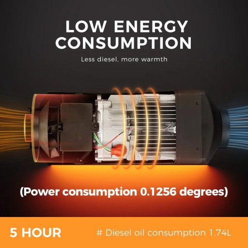 Niskie zużycie energii: Zużycie paliwa: 0,11–0,48 (l/h); Paliwo benzyna: Tylko olej napędowy. Nagrzewnica na olej napędowy jest wyposażona w pompę olejową, która precyzyjnie kontroluje dopływ paliwa, co zapewnia dokładne spalanie, oszczędza energię i zapewnia płynną pracę. Pełny zbiornik paliwa o pojemności 5 l/1,3 galona zapewni zasilanie ogrzewacza nawet przez 100 godzin, gwarantując niską emisję i długotrwałą pracę.