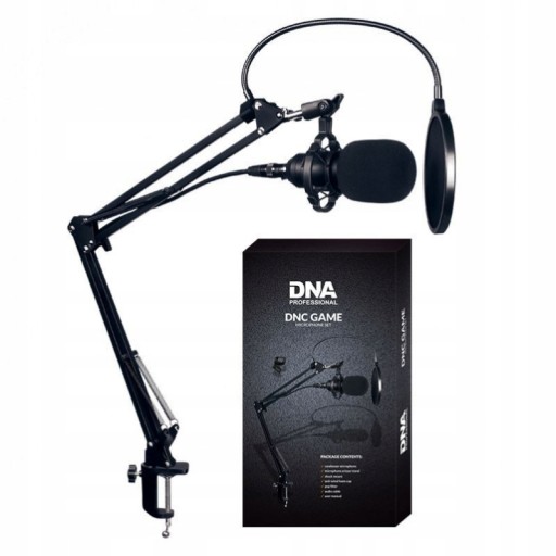 DNA DNC GAME to desktopowy zestaw mikrofonowy, w którego skład wchodzą mikrofon pojemnościowy wraz z koszem antywstrząsowym, ramię wysięgnikowe przykręcane do blatu, filtr przeciwwietrzny zakładany na mikrofon oraz pop-filtr na „gęsiej szyjce” tłumiący powstawanie tzw. zgłosek wybuchowych i przewód XLR-jack. Komplet doskonale sprawdza się w domowym studiu nagrań, szeroko pojętym homerecordingu, stacjach radiowych, a także podczas nagrywania podcastów, tekstów lektorskich i instrumentów akustycznych. Szerokie pasmo przenoszenia, wysoka czułość i jednokierunkowość mikrofonu sprawiają, że rejestrowany obraz audio jest bardzo dokładny. Wysięgnikowe ramię z szerokim zakresem ruchów pozwala precyzyjnie ustawić mikrofon względem źródła dźwięku w każdych warunkach. To w pełni profesjonalny, a jednocześnie stosunkowo tani zestaw mikrofonowy do nagrywania renomowanej marki DNA, dostępny w najlepszej cenie przygotowanej przez sklep muzyczny Music Express.