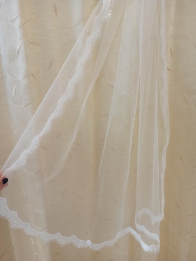 na grzebyku, obszyty delikatną francuską taśmą koronkową z rzęsami