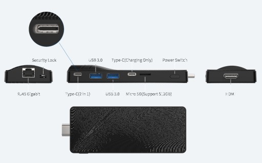 Pc Stick S8 Plus komunikuje się przy pomocy sieci RJ45 100/1000,