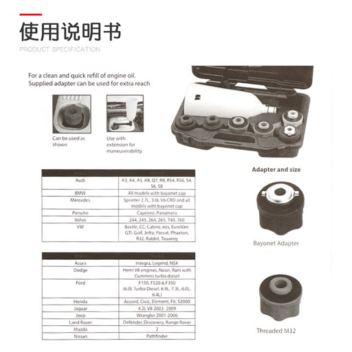 1. Lejek wykonany jest z mocnego tworzywa sztucznego i wyposażony w złącze bagnetowe. 2. Umożliwia szybkie napełnianie olejem bez rozlewania i marnowania. 3. Doskonały do pojazdów z wewnętrznymi przegrodami. 4. Kolorowe adaptery pasują do otworów wlewu oleju w wielu pojazdach europejskich, azjatyckich i amerykańskich. 5. Plus przesunięta rura przedłużająca z funkcją obrotową do trudno dostępnych miejsc.