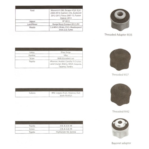 Colorful adapters fit oil filler holes on many European, Asian, and US vehicles.