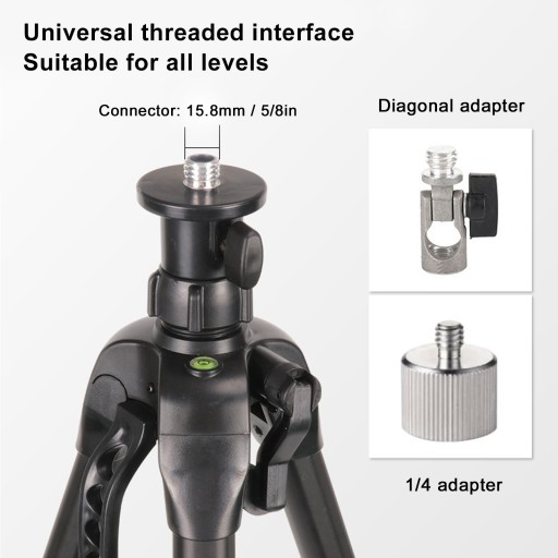 5. SPECYFIKACJA GWINTU: Statyw z poziomicą wyposażony w adapter 1/4, uniwersalne złącze gwintowane, odpowiedni do wszystkich poziomic, użyteczny i praktyczny, bardzo pomaga