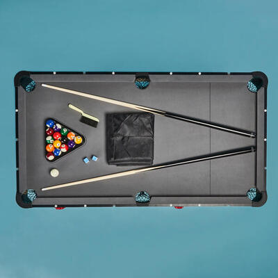Do poznawania i nauki gry w bilarda amerykańskiego w domu. Ucz się i rób postępy w grze w bilarda, dobrze się przy tym bawiąc. Pomysłowy bilard: mobilny, łatwy do złożenia, z wieloma schowkami. Ten precyzyjny i kompaktowy stół bilardowy zachwyci zarówno młodych, jak i starszych.