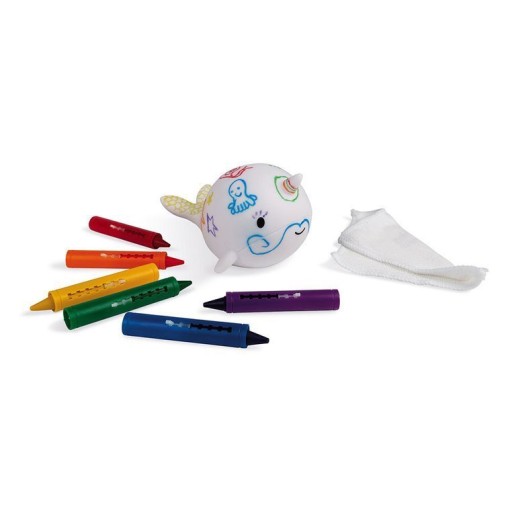 Narwal do kąpieli i kolorowania z 6 kredkami 3+, Janod. Urokliwy narwal do kąpieli i kolorowania francuskiej marki JANOD to wytrzymała zabawka z wodoodpornego tworzywa, która można wielokrotnie i na różne sposoby ozdabiać. Oprócz białej rybki w zestawie znajduje się 6 kolorowych sztyftów (żółty, pomarańczowy, czerwony, fioletowy, niebieski i zielony) w osłonkach z tworzywa oraz opakowanie na nie, wyposażone w przyssawkę, dzięki której można je przyczepić do powierzchni wanny lub łazienkowych kafelków, a także mięciutka ściereczka do wycierania zabawki.