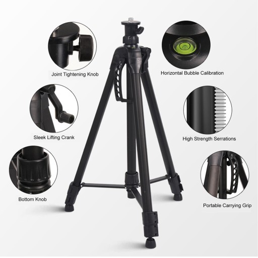 4. Regulowana wysokość: statyw do podnoszenia narzędzia poziomującego można rozłożyć do 180 cm, a drążek do podnoszenia głowicy może osiągnąć 27 cm, zapewniając dodatkową wysokość i elastyczność w różnych zastosowaniach.