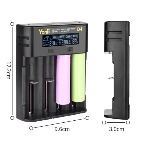 Ładuje 1-4 ogniwa Li-ion 3,6 / 3,7V oraz Ni-MH o dowolnej pojemności w rozmiarach