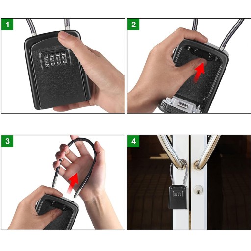 【Przenośna konstrukcja — bez instalacji】🔑 Po prostu zawieś sejf na klucze na klamkach, płotach, balustradach itp. za pomocą odłączanego haczyka — można go otworzyć tylko po otwarciu sejfu na klucze.