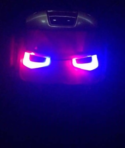 - Maska lekka nie obciąża głowy dziecka podczas noszenia, dodatkowo maska świeci na czerwono i niebiesko, wszystko za sprawą diod umieszczonych w okolicy oczu