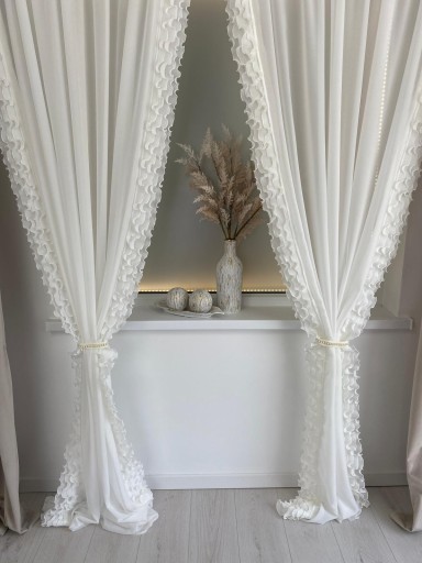 Brzegi firany zdobią efektowne falbany, które dodają całości lekkości i finezji, wprowadzając do pomieszczenia romantyczny i zwiewny klimat. W zestawie znajduje się również ozdobny troczek z perełkami, który umożliwia efektowne upięcie firany, podkreślając jej dekoracyjny charakter i dodając elegancji.