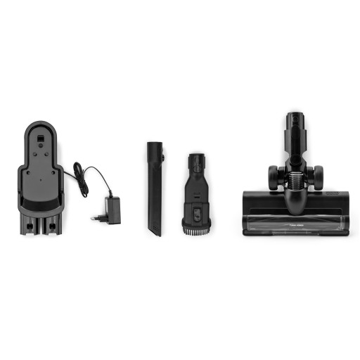 Odkurzacz można łatwo zamontować na ścianie, co oszczędza miejsce i pozwala na wygodne przechowywanie. Uchwyt naścienny z zasilaczem w zestawie. Dzięki temu odkurzacz jest zawsze pod ręką, gotowy do użycia.