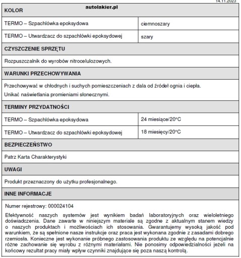 - Przestrzegać wymaganych ilości utwardzacza. Wymieszać dokładnie składniki do uzyskania jednolitego koloru. Proporcje wagowe składników: 40 g TERMO szpachlówka epoksydowa dodać 10 g TERMO utwardzacz do szpachlówki epoksydowej (4:1). Czas wiązania: 30-60 minut w temp. 20st. C.