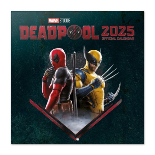 Kalendarz ścienny na rok 2025 Deadpool & Wolverine, od stycznia do grudnia. Wymiary grafik: 29,5 x 29,5 cm, oprawa zeszytowa. Zawiera 12 obrazów oraz plakat wewnątrz nawiązujące do filmu. Posiada otwór o średnicy 5 mm do zawieszenia na ścianie. Okładki wykonane są z matowego i laminowanego papieru powlekanego o gramaturze 250 g/m². Kartki kalendarza są wykonane z matowego papier powlekanego o gramaturze 150 g/m². Dostępny w językach: angielskim, hiszpańskim, francuskim, włoskim, niemieckim i portugalskim. Prezentowany w kopercie z kartonu o gramaturze 300 g/m² i wymiarach 30 x 30 cm.