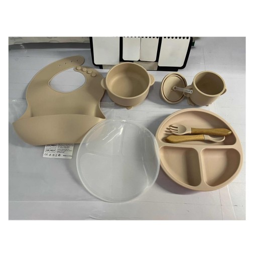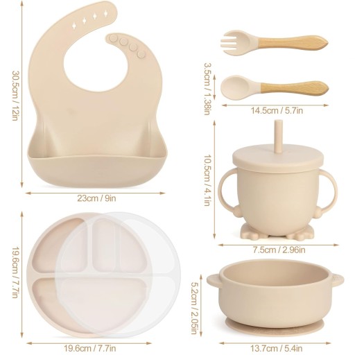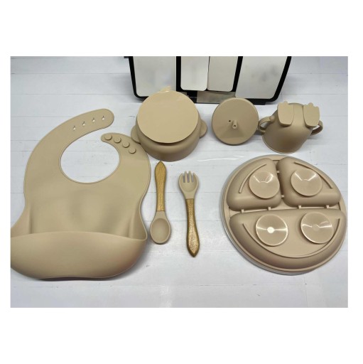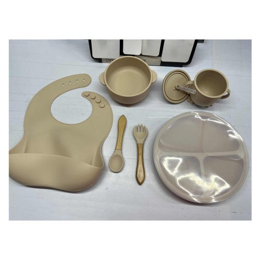 НАБОР ДЕТСКОЙ ПОСУДЫ И СТОЛОВЫХ ПРИБОРОВ БЕЖЕВЫЙ СИЛИКОНОВЫЙ 7 ШТ.