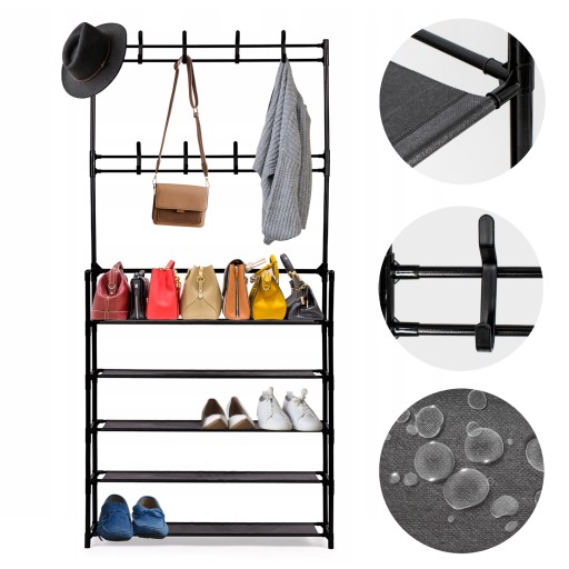 ➡️ Funkcjonalność: Wieszak FRIDA oferuje pięć poziomów półek, które idealnie nadają się do przechowywania różnych rodzajów obuwia – od sneakersów po botki. Dodatkowo, osiem haków umieszczonych w dwóch rzędach zapewnia dodatkową przestrzeń na torby, szaliki i odzież wierzchnią.
