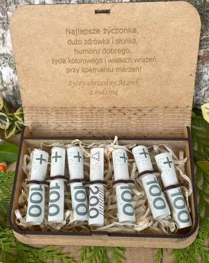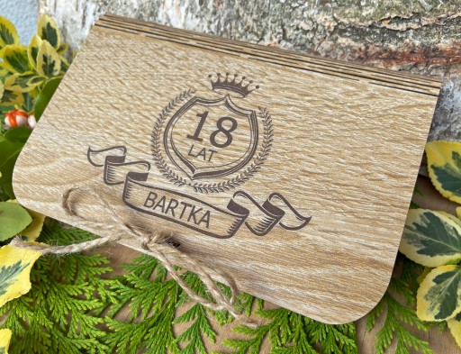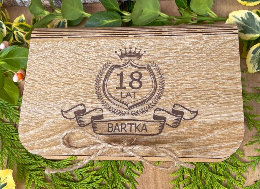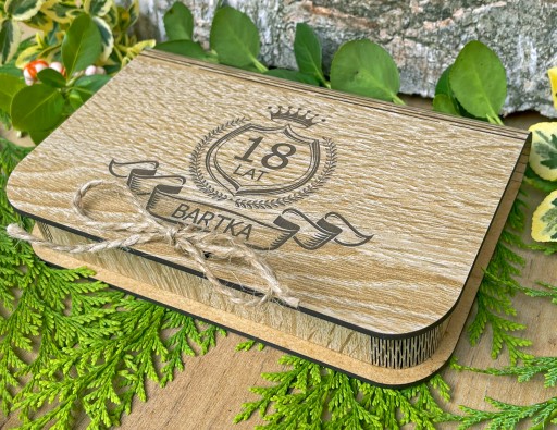Piękne drewniane pudełko z grawerem na pieniądze lub inny upominek z okazji urodzin lub rocznicy.