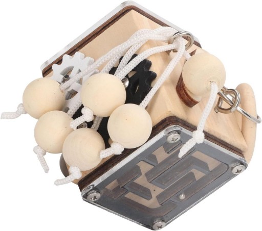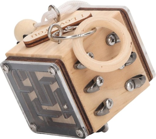 Kostka wykonana z drewna z dodatkiem elementów metalowych i sznurka a jej poszczególne ścianki to: