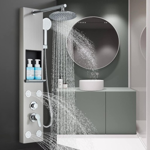 To ekskluzywny, stylowy, nowoczesny panel prysznicowy z hydromasażem, słuchawką prysznicową i deszczownicą oraz półką na kosmetyki. Produkt wykonano z zastosowaniem najwyższej klasy stali nierdzewnej, mosiądzu oraz najwyższej jakości tworzyw sztucznych ABS. Panel z deszczownicą i hydromasażem zawiera wszystkie niezbędne elementy do montażu w Waszej łazience, pokoju kąpielowym czy prywatnym SPA.