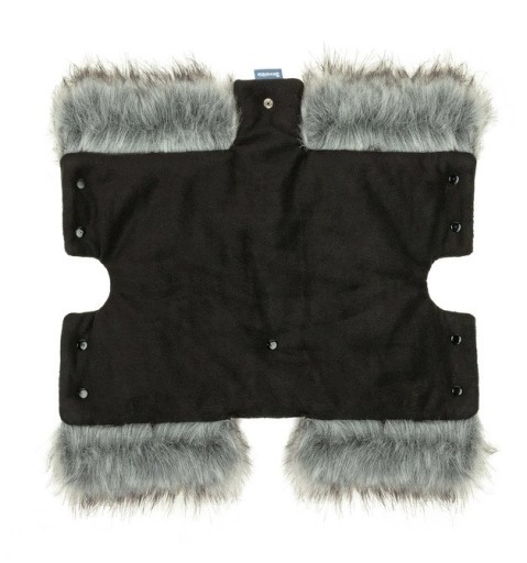 Uniwersalna Mufka do wózka z liskiemchroni dłonie przed niekorzystnymi czynnikami atmosferycznymi. Dzięki zapięciom z napami nie zsuwa się z rączki wózka bądź sanek. Z zewnątrz jest obszyta nieprzemakalnym materiałem, w środku wypełniona miękkim polarem. Posiada warstwę wypełnienia poliestrowego, które izoluje od zimna. Uroku całości dodaje obszycie sztucznym futerkiem.