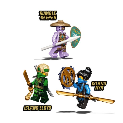 - Zestaw ninja zawiera trzy minifigurki. Wyspiarski Lloyd oraz wyspiarska Nya mają broń, która pozwoli im zmierzyć się ze strażnikiem grzmotu wyposażonym w fajną włócznię i tarczę.