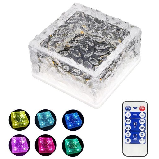 1. Słoneczne lampki z kostkami lodu. Lampka do kostek lodu składa się z 4 diod LED o 6 kolorach: czerwonym, niebieskim, zielonym, żółtym, jasnoniebieskim i fioletowym. Pokryty kwadratowym szkłem, wykonanym ze szkła żywicznego zamiast szkła hartowanego, w szklanej kostce osadzony jest lekki i trwały panel słoneczny. Przycisk włączania/wyłączania na dole, w zestawie pilot z 12 przyciskami. Wymiary elementu: 105x105x55 mm.