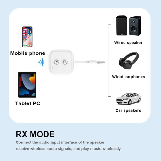 - RX Receiving Mode: Connect to the audio input interface of the speaker, receive wireless audio signals, and play music wirelessly